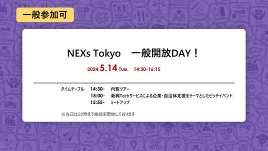 また、当日は一般開放DAYとして、NEXs Tokyoを開放しております。様々な方と交流できるチャンスですので、ぜひNEXs Tokyoへご来場ください。