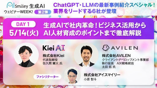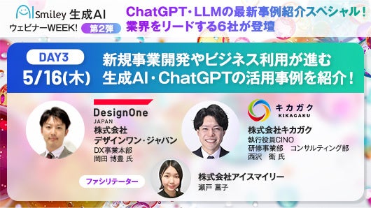 国内最大級のAIポータルメディア「AIsmiley」を運営するアイスマイリー(東京都渋谷区、代表取締役:板羽晃司)は、2024年5月14日(火)~5月16(木)の3日間12時から「生成AI・LLM・ChatGPT」をテーマにウェビナーを開催します。