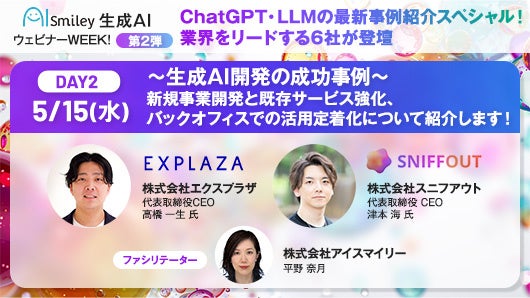 題して、AIsmiley生成AIウェビナーWEEK!第2弾、 ChatGPT・LLMの最新事例紹介スペシャル!業界をリードする6社が登壇、3日間にわたり様々なテーマで生成AIウェビナーを実施いたします。