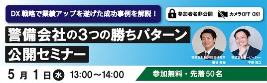 「プロキャス警備」などシステム開発事業を行う株式会社シービーティー(本社:東京都中央区、代表取締役社長:若村和明)は、株式会社船井総合研究所(本社:大阪府大阪市、代表取締役社長:真貝大介)と、2024年4月17日(水)にオンラインにて「DX戦略で警備会社の業績アップへ」をテーマにウェビナーを開催しました。今回はご好評につき第二弾として、5月1日(水)13:00~の追加開催が決定しましたのでお知らせいたします。(※内容は4月17日開催と同様です)【お申込みページ】2024年5月1日(水) 13:00~14:00