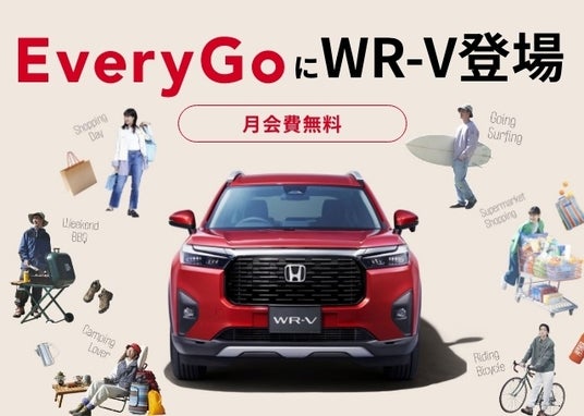 ・EveryGo WR-V専用サイト:https://everygo.jp/lp/wr-v/ EveryGoは、都市部を中心に誰でも気軽にHondaの四輪車を利用できるカーシェアサービスとして、2017年11月に開始しました。月会費無料で、Hondaの安全運転支援システム「Honda SENSING (ホンダ センシング) 」を搭載したモデルを中心に最新のHonda車をご利用頂けるサービスとして多くの会員様にご好評いただいています。