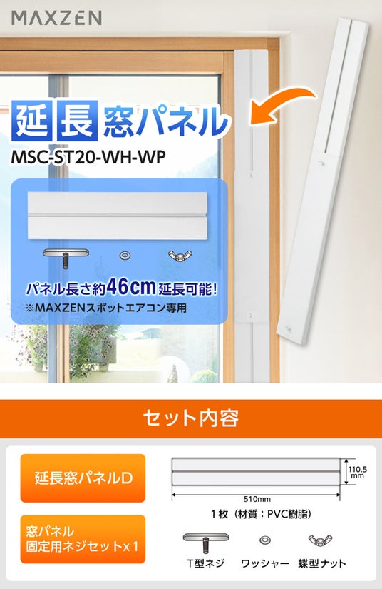 付属の窓パネルでは長さが足りない場合、別売で延長窓パネルをご用意しております。この延長パネルで、通常のパネルから約46cm長さを延長することができます。