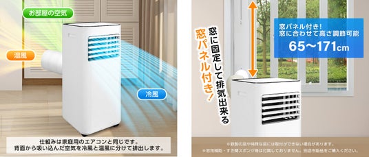スポットエアコンは、背面から取り込んだ空気を冷風と温風に分け、正面の吹き出し口からは冷風を、背後の排気口からは温風を排出します。通常のエアコンは室外機から温風を排出しますが、スポットエアコンは背後のダクトから温風を排出する点で異なります。そのため、付属の窓パネルを使用して排気ダクトを窓に固定して、温風を室外に排出することで、お部屋の冷却効率を向上させることができます。