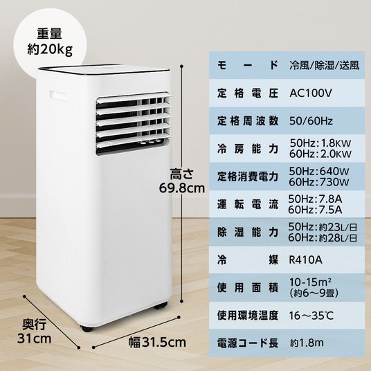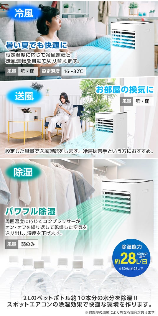 本製品には、冷風・送風・除湿の3つの運転モードが搭載されており、設定温度に合わせて冷風と送風を自動で切り替える為、暑い夏でも快適にお過ごしいただけます。また、除湿は、1日当たり約28L(※西日本など60Hz地域の場合で、東日本など50Hz地域の場合は1日当たり約23L、2Lペットボトル約10本分に相当)で、の除湿能力を有しており、不快な湿気を取り除いて梅雨時でも過ごしやすく、部屋干しをしやすい環境を整えます。
