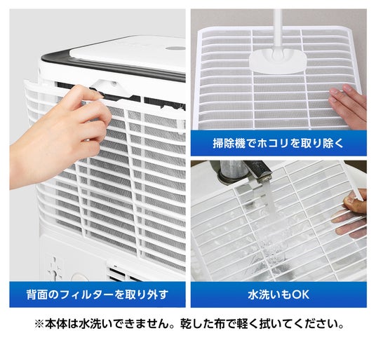 本体背面にあるフィルターは取り外し可能で、水洗い可能な為、かんたんにお手入れすることができます。