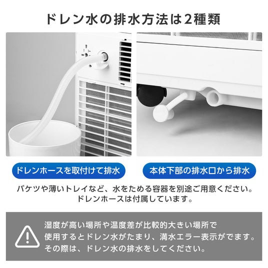 スポットエアコンの運転中にはドレン水(除湿水)が発生しますが、本製品ではノンドレン方式を採用しており、ドレン水を蒸発させて温風として排出することができます。そのため、ドレン水の排出頻度を減らし、排水の手間を軽減(※)できます。排水するドレン水は、ドレンホースまたは下部排水口を使用して排水することができます。