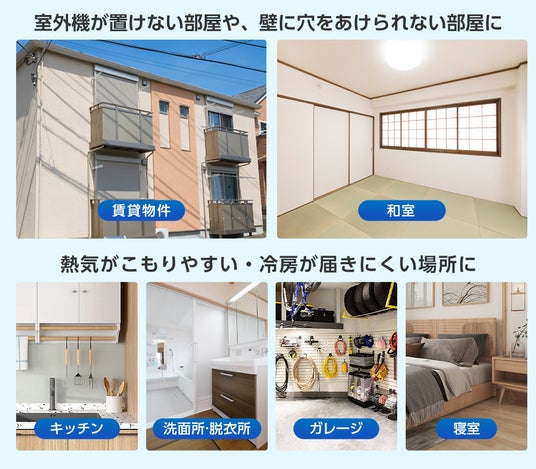 設置するのに工事が不要で、なおかつ、スムーズに動く4つのキャスターにより、どこでもかんたんに移動ができます。ベランダやバルコニーが小さい(無い)賃貸物件のような室外機が設置できないお部屋や、壁に穴を空けることが難しい和室、火の取扱いにより温度が上がりやすいキッチン、洗面所や脱衣所、寝室など、必要に応じて家中どこでもお使いいただける製品です。