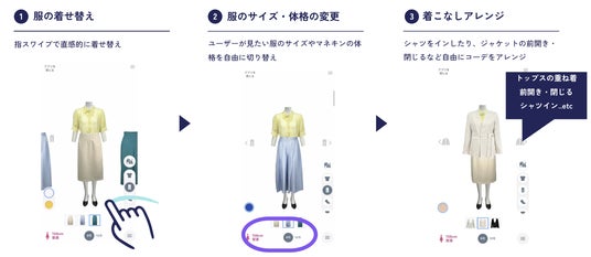 (スカートやパンツにシャツをインさせたり、インナーとアウターとの重ね着、ジャケットの前を開ける・閉じるなどのディテールの実現でよりリアルな試着体験を再現)