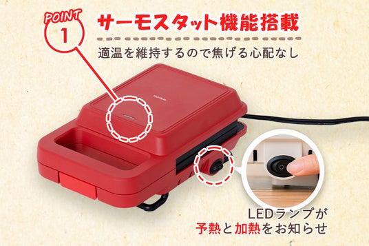 サーモスタット機能搭載で、適温を維持するため、ホットサンドが焦げる心配は不要。