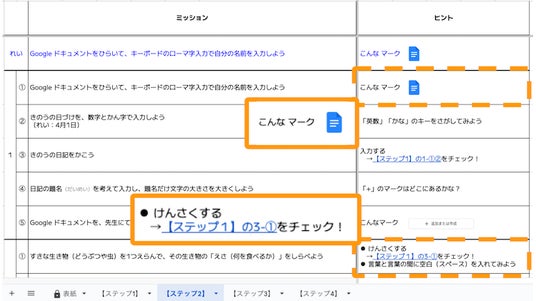 各ステップで情報活用能力を育むための活動(=ミッション)が設定されており、ミッションごとにクリアするためのヒントが記載されています。全てのステップが同じ Google スプレッドシート(TM) のファイルに集約されているため、ステップ1からじっくり進めてみたり、困ったときにはヒントを参照して前のステップに戻ったりと、子どもたちが自分に合ったステップを選択し、それぞれのペースで取り組むことが可能です。