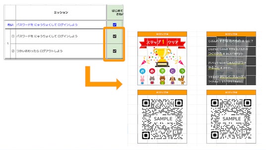 ミッションを達成してチェックボックスをクリックしていくことで、表紙のイラストやQRコードが徐々に完成します。身に付けた力やスキルを活かして取り組む新たなミッションが浮かび上がってきたり、完成されたQRコードを読み取るとオリジナル動画や Google のツールをより有効に活用するためのヒント集(PDF)を見ることができたりと、魅力的な特典を設定しています。