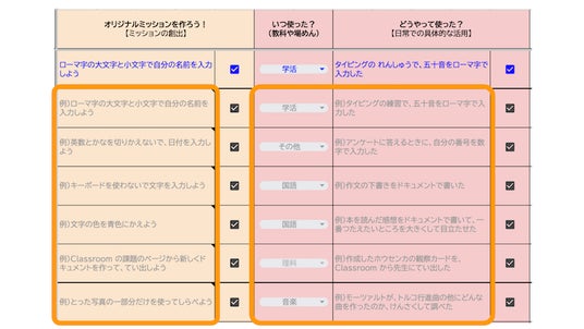 「活用表 バージョン2」の中には、子どもたちが活用表に取り組む中で初めて知ったことや覚えたこと、自ら発見した機能や活用アイデアを記載する項目があり、自分の言葉で書き留めていくことで一人一人オリジナルの活用表が完成されていきます。