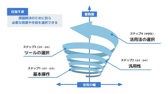 ステップ1では基本操作の習得、ステップ2では汎用的なツールの活用、ステップ3では場面に応じたツールの選択、ステップ4では課題解決のための活用方法の選択、と活用の幅を広げ、繰り返し取り組む中で習熟度を高めながら目指す姿に向かっていくことができます。