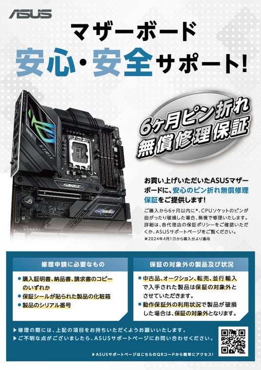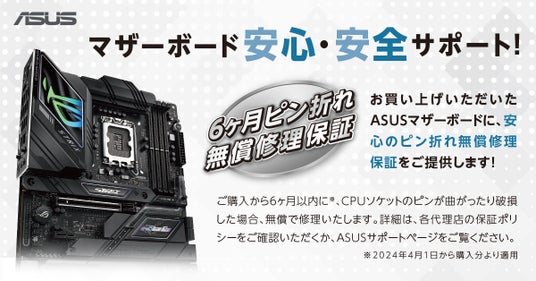 ASUS JAPAN株式会社は、2024年4月1日購入分より6ヶ月間のCPUソケットピン折れ無償修理保証「マザーボード安心・安全サポート!」を開始します。