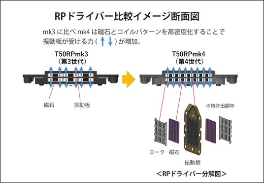 50年に渡り改良を重ねてきたRPテクノロジーの全面駆動型平面振動板ドライバーは、第4世代で平面振動板の振動領域の拡大と均一化のため、振動板を挟み込むマグネットを増量しプリンテッドコイルのパターン形状を新設計しました。さらに磁気回路の構成部品も一新して磁束分布を最適化することで、振動板の不要共振を抑え鋭いレスポンスでの音の立上がりと立下がりを実現。これまでに培った様々な技術を全面的に導入して開発された第4世代ドライバーは、感度の向上、モニタリングしやすい滑らかな周 波数特性、優れた過渡特性を同時に達成しています。重低音域から高音域まで正確かつ繊細に再生可能とすることで、正確な定位感と音場の再現能力を従来よりさらに向上させました。