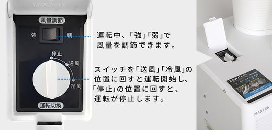 ダイヤルを回すことで、停止・送風・冷風の運転モードを切り替えることができます。送風の強弱は、スイッチのON/OFFで切り替えることができます。ダイヤルとスイッチの操作はシンプルでかんたんなので、誰でも利用できます。