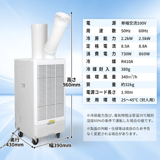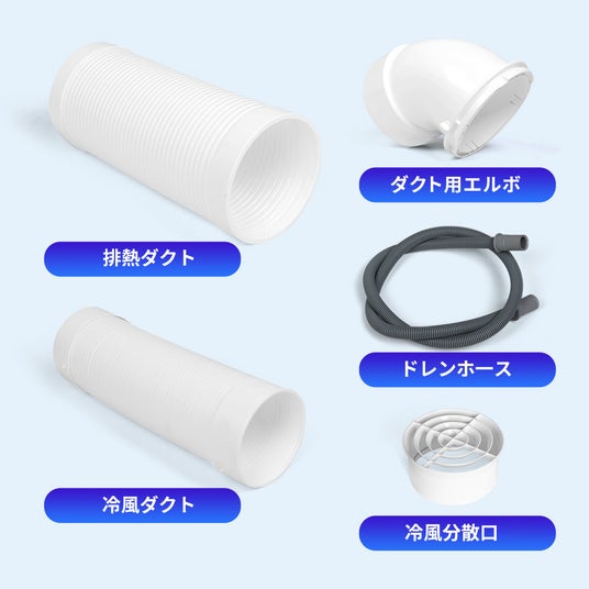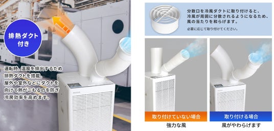 本製品には排熱ダクトがあり、温風を屋外に排出することで熱のこもりを防ぎ、冷房効率を高めます。また、冷風ダクトには付属品の分散口をセットすることで、冷風を分散し、風の当たりを和らげることができます。