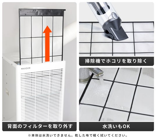 本体背面にあるフィルターは取り外し可能で、水洗い可能な為、かんたんにお手入れすることができます。