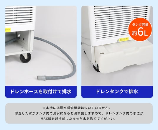 スポットクーラーの運転中にはドレン水(除湿水)が発生します。ドレン水の排水方法は、ドレンホースを取り付けて排水する方式と、ドレンタンクに貯まったドレン水を排水する方式の2つがあります。ドレンタンクの容量は約6リットルもあり、排水の頻度を抑える仕様となっております。