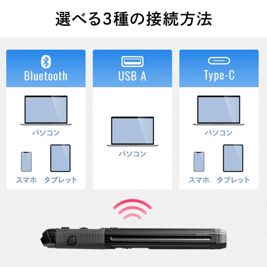- Bluetooth、USB Type-CとType-Aで接続でき、パソコン・スマホ・タブレットに対応