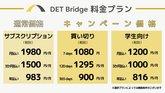 DET Bridgeはユーザーそれぞれの留学準備期間に合わせて無駄な出費を最低限にするよう、期間別に3種類の料金プランを用意しており、最安で月額1,081円(税込)で利用することができます。学生の方にはさらにお得な学割プランを用意しており、最安で月額898円(税込)で利用できるため、少しでも留学準備費用を抑えたい方への強い味方となります。