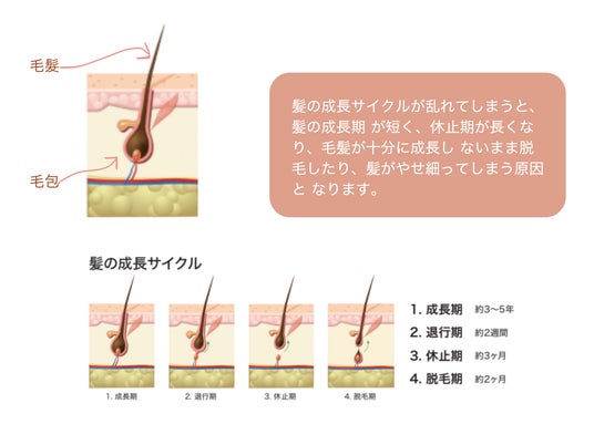 頭皮には毛包(もうほう)という皮膚組織があります。毛包は頭皮の内側でポケット状の形状をしており、成長する毛根を包んでいます。毛包が毛根を守り、毛包につながる微小循環が栄養を与えているのですが、その毛包が不健康になると、正常な毛髪の成長サイクルが阻害され、抜け毛・薄毛につながります。そのため、毛包の環境を整え、毛髪の成長サイクルをサポートするヘアケア製品を使ってお手入れすることも一つの方法としておすすめしています。頭皮を清潔に保ち、頭皮の血行や毛包を活性化するようなご自身に合う頭皮ケアを行いましょう。