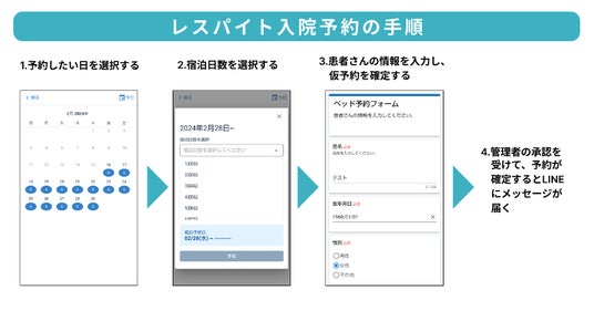 LINE公式アカウントを使った「レスパイト入院予約機能」を用いることで、ケアマネジャーがリアルタイムで、24時間いつでもレスパイト入院が可能な日にちや時間枠を確認することができ、予約までをLINEで簡単に完結することができるようになります。