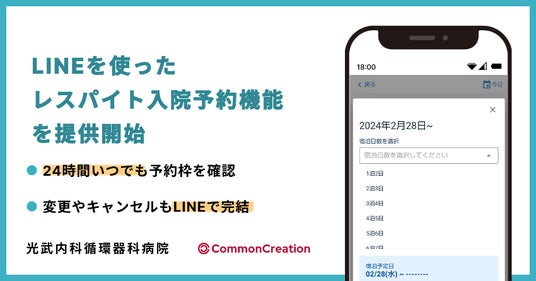 コモン・クリエーション株式会社は、光武内科循環器科病院(以下、光武病院)と協業し、医療・介護従事者向けLINE公式アカウント「光武内科循環器科病院」を開設し、レスパイト入院の予約管理を効率化する「レスパイト入院予約機能」の提供を2024年5月1日より開始いたします。