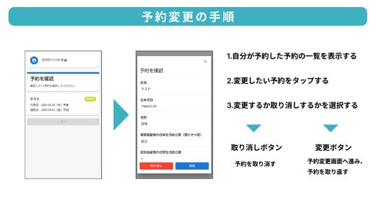 また、予約状況一覧から予約情報をタップすると詳細内容が表示され、予約内容の変更やキャンセルを行うことができます。