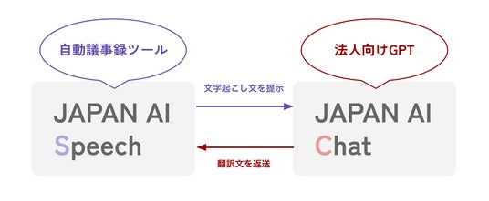 JAPAN AI Speech((TM)) は、JAPAN AI Chat((TM))と連携しており、 JAPAN AI Speech((TM)) が作成した議事録に対してJAPAN AI Chat((TM))が、予め用意されている翻訳用プロンプトを用いて翻訳を行います。