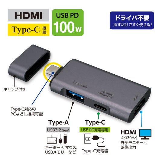マウスやUSBメモリなどの利用を想定したType-Aポートも搭載。差し込んですぐに使えるドライバ不要タイプです。