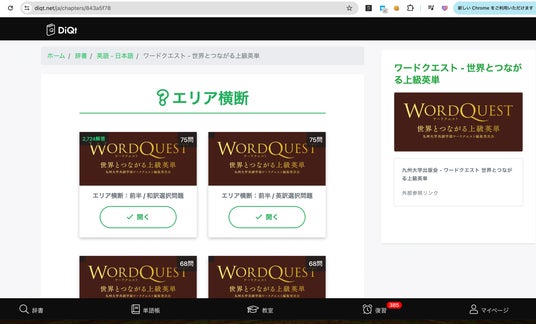 九州大学共創学部の制作した「世界とつながる上級英単」WordQuest(ワードクエスト)が、DiQt(ディクト)上で効率的に学習できるようになりました。