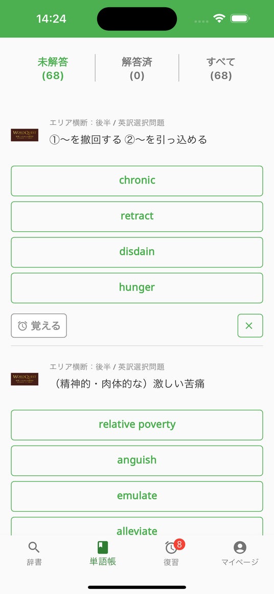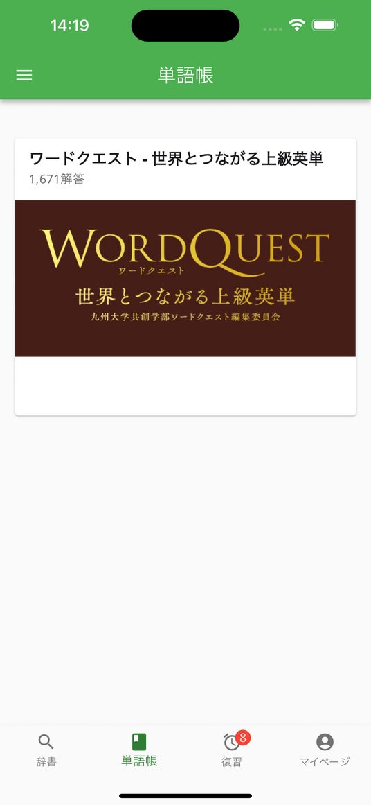 会員登録・ログインした後、タブバーの「単語帳」をタップしていただき、一番下の「ワードクエスト - 世界とつながる上級英単」をタップすることでご利用いただけます。