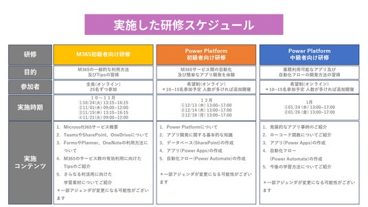 2023年7月より取り組みを開始し、まずはMirosoft 365の初級者向けの研修を実施しました。社内でTeamsやSharePoint及びPlannerといったツールを利用することが前提だという共通認識を醸成していきました。