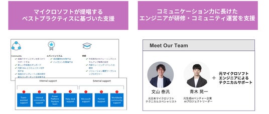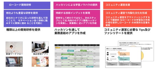 また、ローコード開発の定着化のために単発の研修だけで終わらず、ハッカソンや社内ユーザーコミュニティの形成まで支援します。