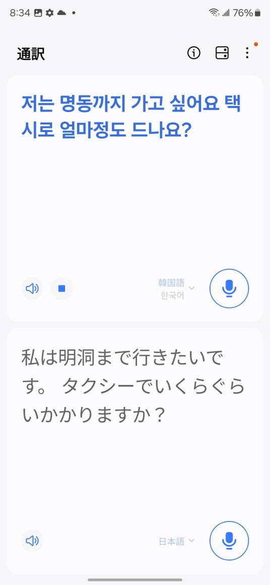 道に迷ったとき、タクシーで料金を確認したいとき、お店で欲しい物の好きな色がなかった時、飲食店でテイクアウトを伝えたいとき、フライトが急に変更になり外国人のキャビンアテンダントと会話をしたいなど、困ったときや質問・会話をしたいときに便利にご利用いただくことができます。本機能は日本語を含む13カ国語※の言語に翻訳することが可能で、本機能はGalaxyのオンデバイスAIを搭載しているため、フライトモードでもご利用いただけます。