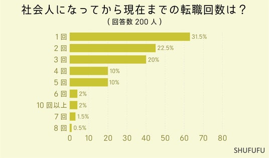 社会人になってから現在までの転職回数の問いに対して最も多かったのが「1回(31.5%)」でした。 次いで「2回(22.5%)」「3回(20%)」という結果でした。4回以上転職している人は少数派のようです。