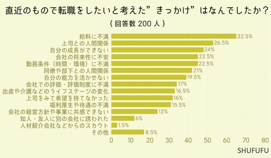 直近のもので転職をしたいと考えた”きっかけ”はなんでしたか?(3つまで選択可)に関しては1位「給料に不満(32.5%)」、2位「上司との人間関係(26.5%)」でした。給料と職場の人間関係は働く上でとても重要です。転職したいと考えるきっかけもそこに関連した選択肢が上位の結果になりました。