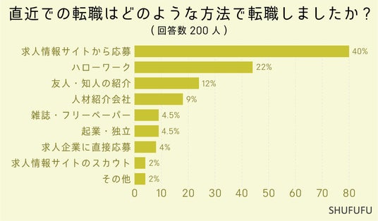 直近での転職はどのような方法で転職したかを尋ねたところ、1位は「求人情報サイトから応募(40%)」、2位「ハローワーク(22%)」となりました。民間の求人情報サイトで募集企業の数が多いため情報量が多く、検索機能も利用しやすいため転職先を探すうえで効率よく希望にあった会社を探しやすいのではないでしょうか。
