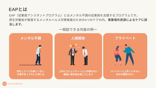 EAP(ハラスメント相談、メンタル不調等)と健康相談(健康診断結果、不眠、疲れやすい等)の両方の機能を有する、産業医監修の外部相談サービスです。