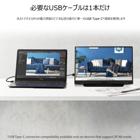 必要なUSBケーブルは1本だけZenScreen MB166Cは、メインデバイスからの電力供給とビデオ伝送の両方に1本のUSB Type-C*接続を使用します。使用するケーブルが少なくなるため、作業エリアが整頓されます。