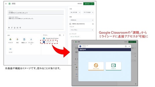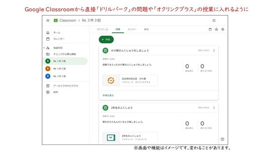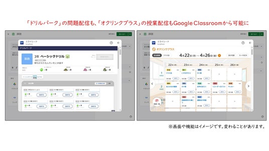 今回、Google Classroomアドオン連携を行うことにより、「ミライシード」内の各アプリは、Google Workspace for Education Plus または Teaching and Learning Upgradeでご利用いただくことができる拡張機能として、Classroomから直接アクセスできるようになります。これにより、例えば、先生がClassroomから「ミライシード」を選択しアダプティブドリル「ドリルパーク」を使って児童・生徒に対して課題配信を行うことができ、児童・生徒もClassroomのストリーム上から、先生が配信した「ドリルパーク」に直接アクセスすることができるなど、Google for Educationとミライシードの行き来が効率化され、利便性が向上します。