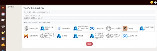 キーワードを入れて、使用する生成AIを選択するだけで簡単にプレゼン資料の台本を柵瀬宇することができます。