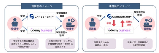 そのような背景の中、多くの企業に学習プラットフォームである「CAREERSHIP(R)」を提供する当社と、質の高い豊富な講座がオンラインで学べる「Udemy Business」を国内展開するベネッセコーポレーションは、学習者が自ら学びを深めやすい環境をつくること、また、人材開発担当者がより効率的、効果的に学習を管理、展開できることを目指し、システムを連携させることといたしました。