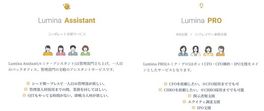 管理部門支援サービス「Lumina」は、代表を始めとするプロフェッショナルチームがクライアントの業務を支援する、リモートアシスタントサービスです。具体的には、シリーズA前後の管理部門構築支援、ファイナンス支援、予算策定、事業計画、資本政策策定などのアドバイスや支援を行います。