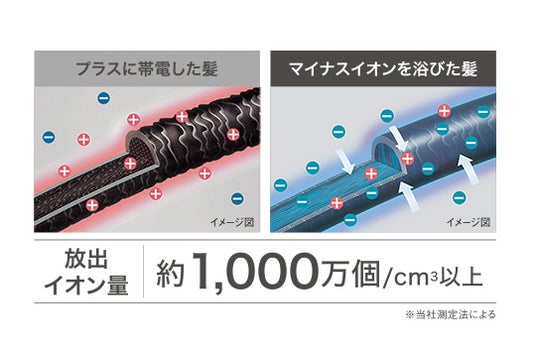 一般的に髪はプラスの静電気を帯電しやすく、ブロー時の髪摩擦によっても発生します。カールドライヤーの使用時にマイナスイオンを放出(※7)することで髪の広がりの一因である静電気を低減し、まとまりのある髪へと導きます。(※7) 放出イオン量約1,000万個/c㎥以上/当社測定法/当社検証法による