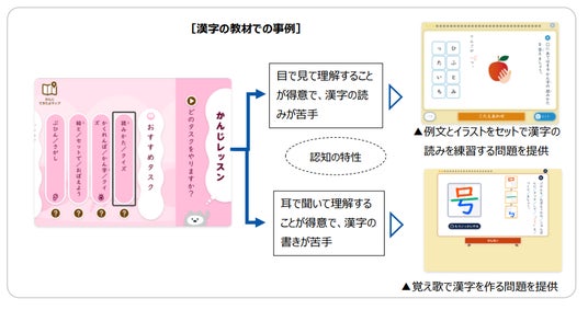 タブレット学習用の教材は、事前チェックテストを行ったうえで、「目で見て理解することが得意で、漢字の読みが苦手」「耳で聞いて理解することが得意で、漢字の書きが苦手」などの個々の特性に合わせ、取り組みやすく個別最適化された学び方での学習素材が提供されます。そして、この教材を、専門的な研修を受けた講師による、双方向型でやる気を引き出すオンライン個別指導※1によるサポートを受けながら取り組みます。お子さまの読み書きのニガテと特性によりそいながら、無学年で読み書きという「学びの基礎スキル」を育んでいきます。
