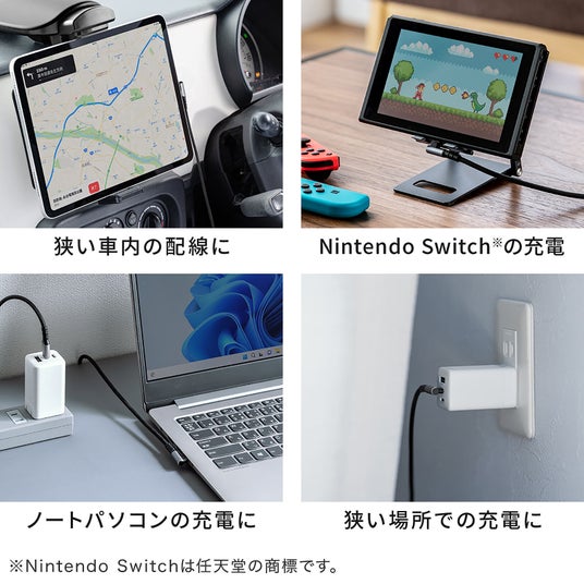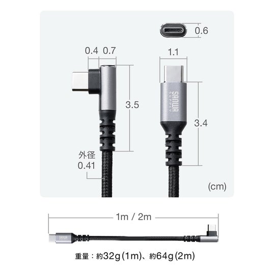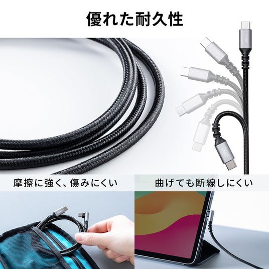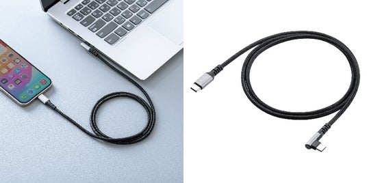 スマホやタブレット、Nintendo Switchなどのゲーム機の充電ケーブルやデータ通信ケーブルに最適で断線に強いメッシュケーブルと片側L字コネクタを採用したUSB Type-Cケーブル