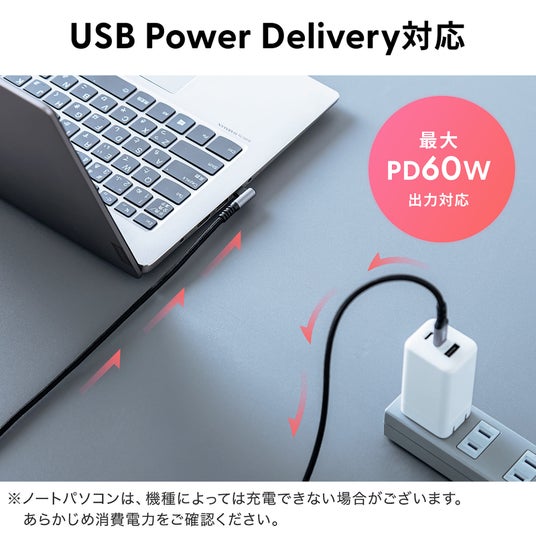 最大60Wの電源供給が可能なUSB Power Delivery(USB PD)に対応し、急速充電やデータ転送を実現。USB Type-Cポートを搭載した機器と接続し、高速かつ安定した充電が可能です。さらに、金メッキ処理を施したピンを使用し、経年変化による信号劣化の心配が少ないのも特長です。