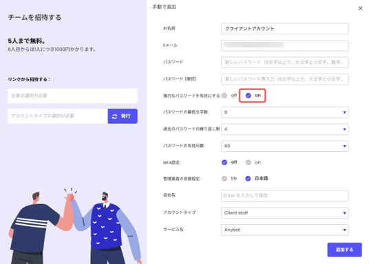 anybotの管理者を追加する際、強力なパスワードを使用するよう設定できます。